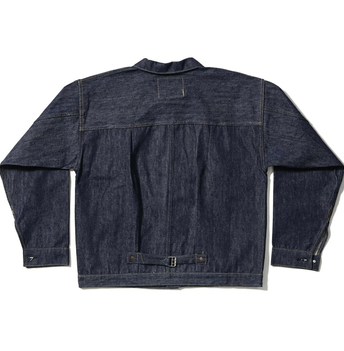 簡素化されたディテール、軍汎用のドーナツボタン、無地の鉄リベットなど「大戦モデル」を象徴するかのような特徴を持つ大戦後期、1945年モデルのデニムブラウス。もとにしたヴィンテージはワンウォッシュ、極上のミントコンディションのサイズ46インチ。さらにヴィンテージ市場で非常に人気の高いT-BACK仕様の個体を再現した。プリーツ部のボックスステッチはかなり小ぶりで、大戦モデルは一般的にオールイエローステッチと認知されているが、本作は一部にオレンジステッチも使用している。バックルは大戦後期のタイプを専用に製作。ムラが強く荒々しいデニムは、前回の1943年モデルともまた異なる魅力を持つ。襟の地の目、太めのカフスも個性的で、全体のサイズ感は大戦期特有の若干小さめの仕上がりとなっている。サイズ46以上の背中は一枚の生地幅では足りないことから、このようなT-BACK仕様となる。