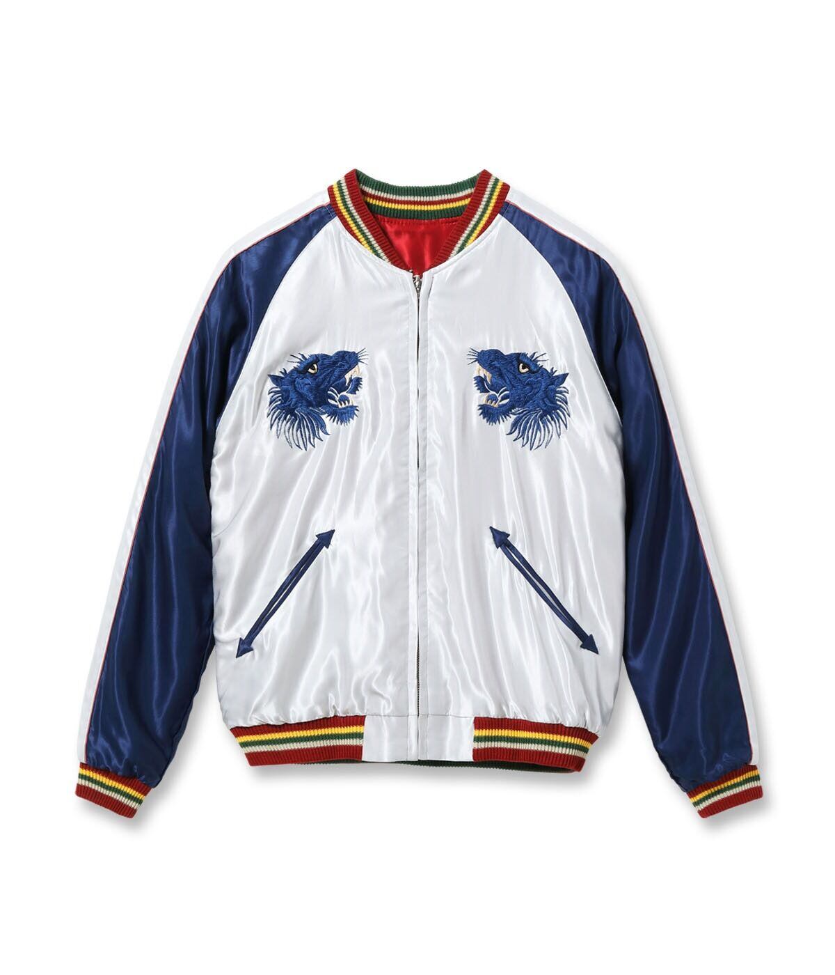 リバーシブル面は、身頃より袖下の色の方が濃いシルバー×ネイビーの「逆配色」ボディに、猛々しく吼えるブルータイガーが映える。光沢のあるレーヨン糸の特徴を生かし、針足を複雑に変えて刺繍を重ね、立体感と陰影によって単色でありながら虎の毛並みや縞模様を表現。表面同様、4色のカラフルなリブがアクセントとなっている。