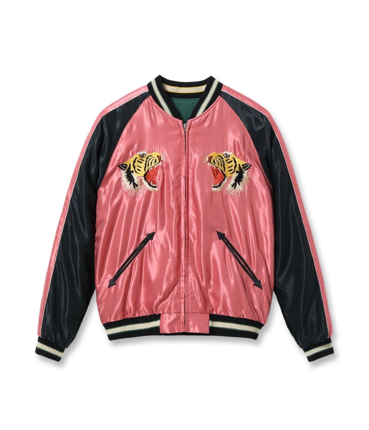 リバーシブル面はスカジャンの王道として人気も高い、咆哮する虎の絵柄。振り幅の狭い横振り刺繍で筋骨隆々な虎の体躯を写実的に描写しており、これは優れた技術を持つ熟練の職人にしか成し得ない業である。ボディは身頃より袖下の色の方が濃い、通称「逆配色」。ピンク×ブラックの組み合わせはフィフティーズカルチャーにおいて絶大な評価を得ている。