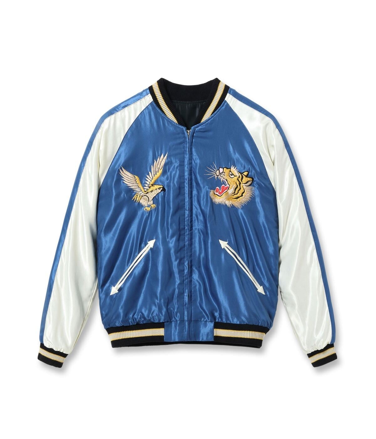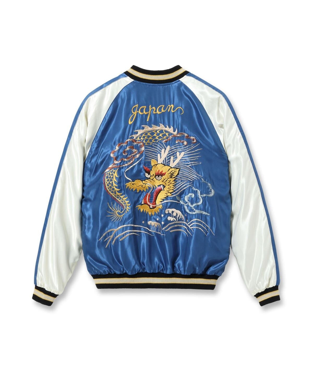 リバーシブル面は波飛沫とともに水辺から姿を現す金龍の絵柄。晴天を想わせるブルーのボディをベースに、長い体躯を雲間に隠しながら迫り来るダイナミックな構図が特徴で、龍の顔にのみ黒いアウトラインを入れることで遠近感と迫力を強調している。胸には鷲と虎が描かれており、スカジャンの三大モチーフである鷲・虎・龍が揃った贅沢な一着。