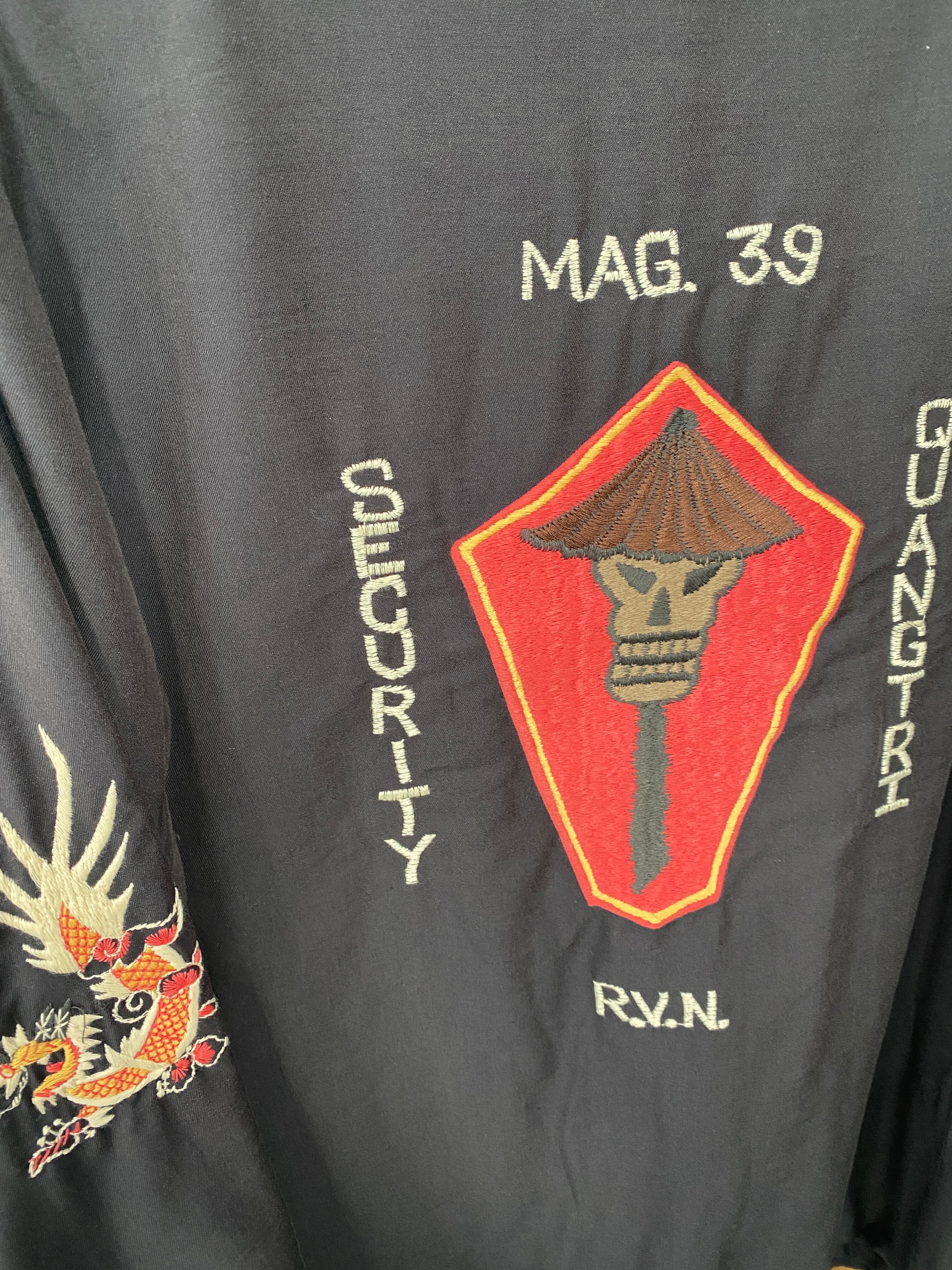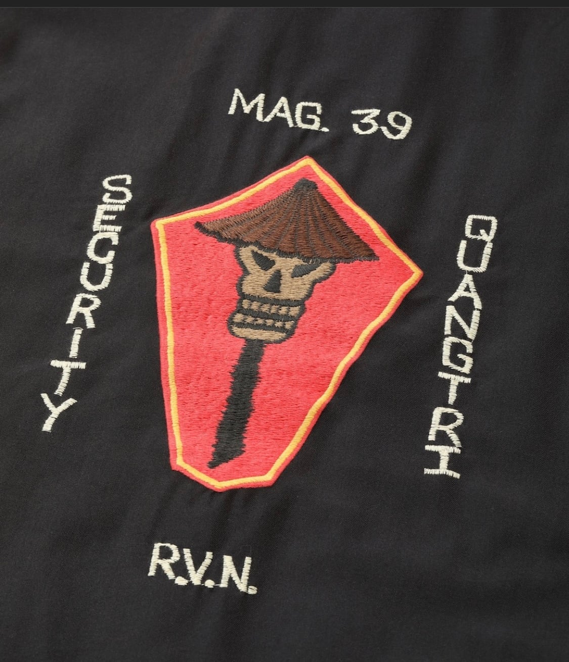 1960年代後期に米兵がカスタムオーダーしたベトジャン。ベトナムのQUANG TRI(クアンチ)という都市に駐留していたアメリカ海兵隊第39航空支援部隊のもので、笠をかぶった独特なスカルはスコードロンパッチと呼ばれる部隊章の絵柄をベースとしている。さらにこのエイジングモデルでは、経年変化により色味がフェードした生地や刺繍糸を再現。レーヨン混のコットンツイルに加工を加えており、しなやかな生地感やドレープ感が特徴で、新品時からヴィンテージさながらの風合いを楽しめる。