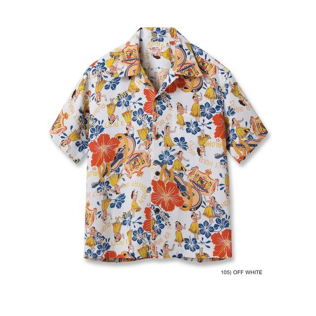 マリヒニ・スポーツウェア社のブランド、マリヒニが 1950年代後期に手掛けた作品。同社を立ち上げたのは日本生まれのレイモンド・ササキという人物で、絵を学んだ経験のあるレイモンドは柄に対してのこだわりが強く、マリヒニ・ブランドのデザインは完成度の高いものが多い。フラガールをはじめ、大胆に描かれたハワイアン・クレストやウクレレ、ハイビスカスが非常に印象的な楽園ハワイを象徴する華やかな一枚。