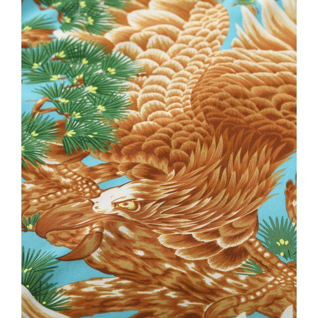 今にも獲物に飛びかかろうとしている、羽を広げた鷹の姿を描いた大作。メイン・モチーフの鷹とグラウンドに描かれた松の枝と葉で構成されたシンプルな作品であるが、そこから伝わる躍動感と迫力は他の鷹や鷲を題材にした柄の中でも一際目立つ存在。力を込めて枝を掴む爪と獲物を捕らえた鋭い眼光など、屈強な鷹の迫力が伝わり、このデザインを手掛けた当時の職人たちの高いレベルがわかる一枚。