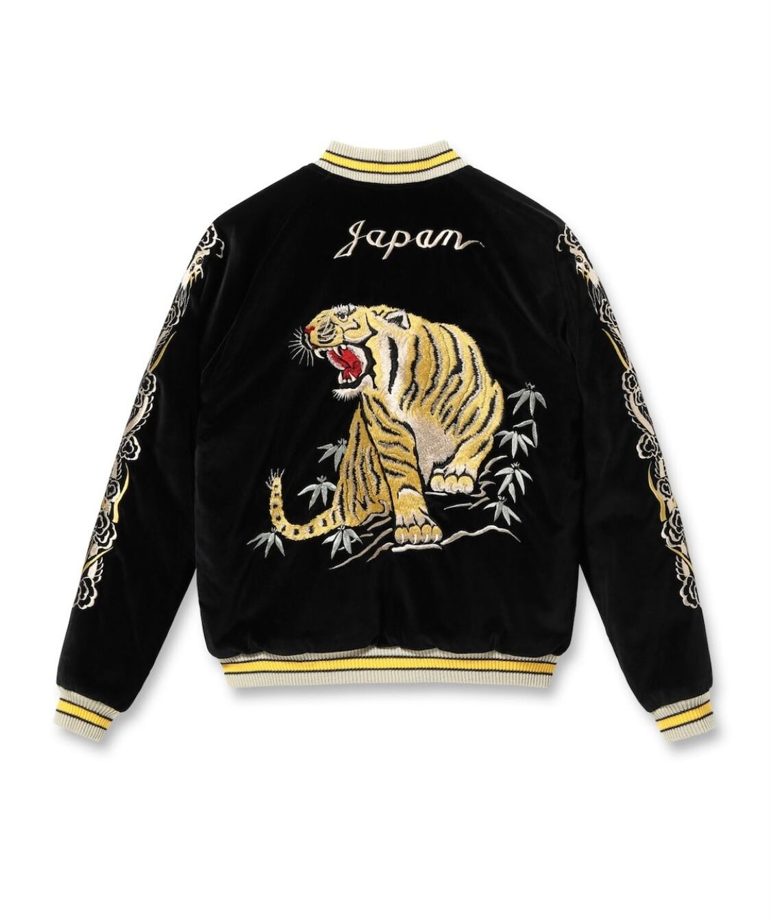 ブラックの別珍生地をベースとし、牙を剥き出して咆哮する迫力の虎を描いた1950年代中期の作品。振り幅の狭い細やかな刺繍で筋骨隆々な虎の体躯を写実的に表現しており、これは優れた技術を持つ熟練の職人にしか成し得ない業。袖に入る昇龍は通常より縦に長く、このような仕様もヴィンテージでは珍しい。