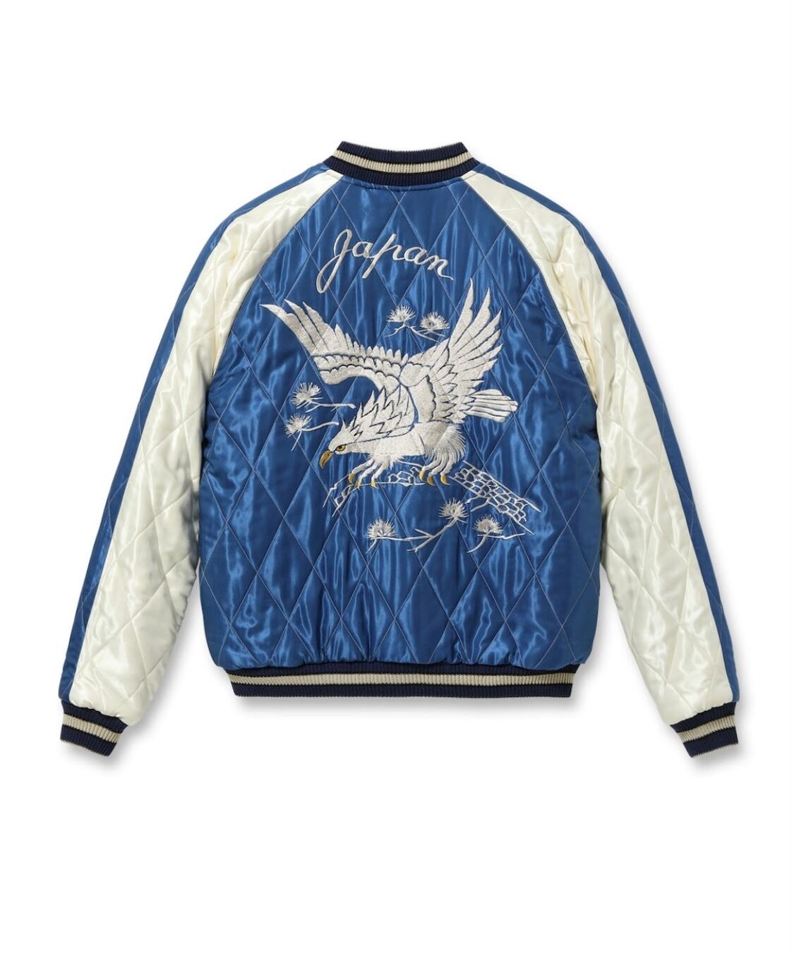 リバーシブル面は晴れ渡る空を想わせるブルーのアセテートに施された白鷲の絵柄。使用する色糸の数を抑え、運針のみで翼を広げた姿を描写している。刺繍の密度が高い鷲に対し、生地の色を生かして繊細な線で描かれた松の枝や余白のバランスの使い方が日本画にも似た芸術性の高い1着。