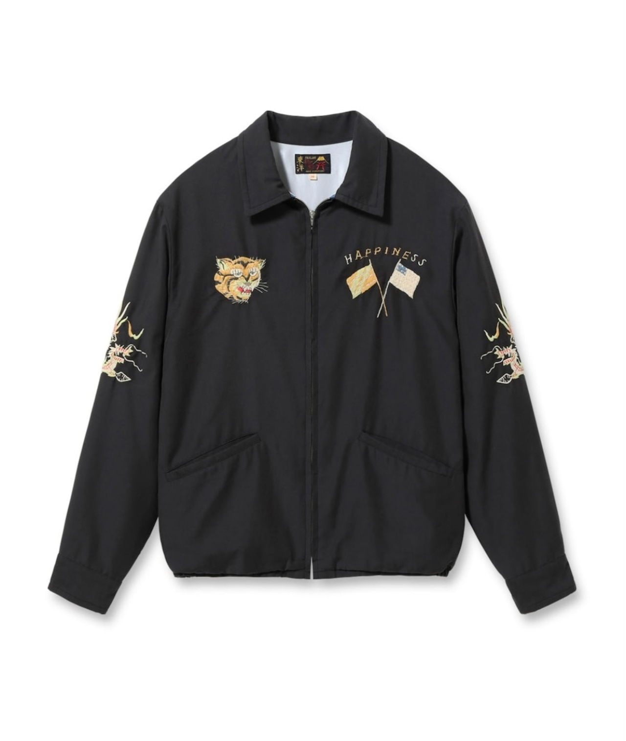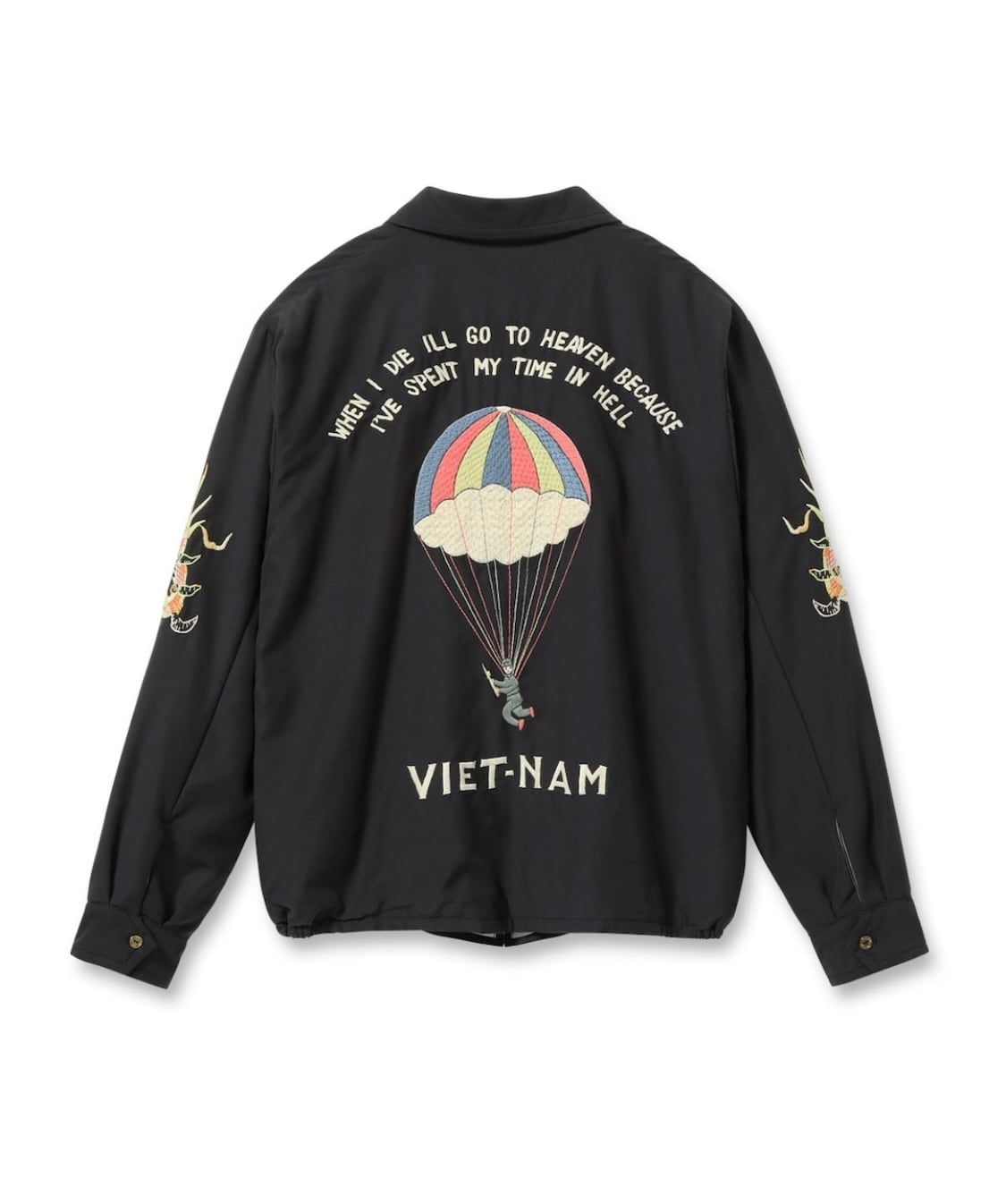 1960年代中期にベトナムに駐留していた米兵がカスタムオーダーで仕立てたジャケット。両袖の龍や右胸の虎はベトジャンの王道的なデザインだが、左胸は漢字の「福」ではなく珍しい2色使いの「HAPPINESS」表記。その下には星条旗と南ベトナム軍のフラッグがクロスし、背中にはパラシュート部隊のモチーフが刺繍されている。