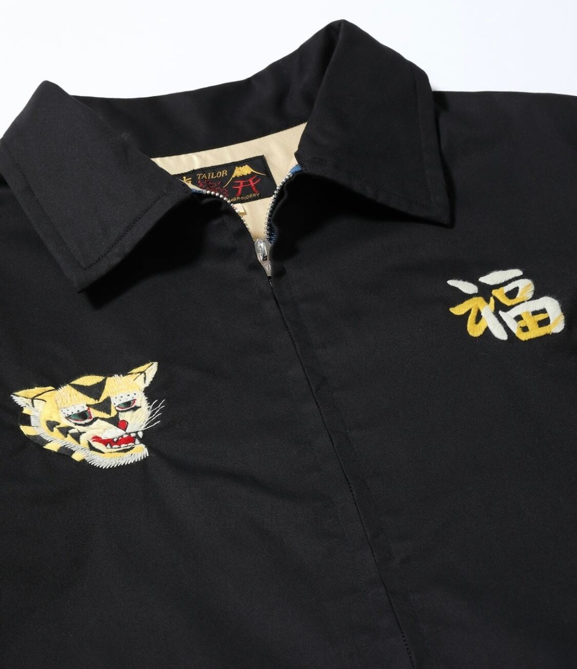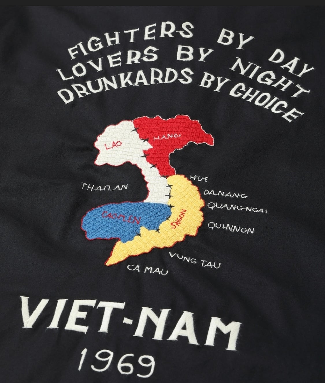 1969年にベトナムへ駐留していた米兵がカスタムオーダーで仕立て、アメリカへと持ち帰った1着を再現。ベトナムマップをメインのモチーフとした王道的なデザインだが、それぞれの刺繍には特徴がある。胸のタイガーヘッドは他と比べてシャープな図案。「福」の文字が2色の色糸で描かれているところも珍しい。背中の地図の中央にはクロスの刺繍が施されており、これも他のベトナムマップ柄には見られない仕様。背面上部のメッセージは途中で途切れているが、それもヴィンテージに基づいて再現している。ブラックに加え、ヴィンテージでもレアなグリーンとオレンジの3色展開。